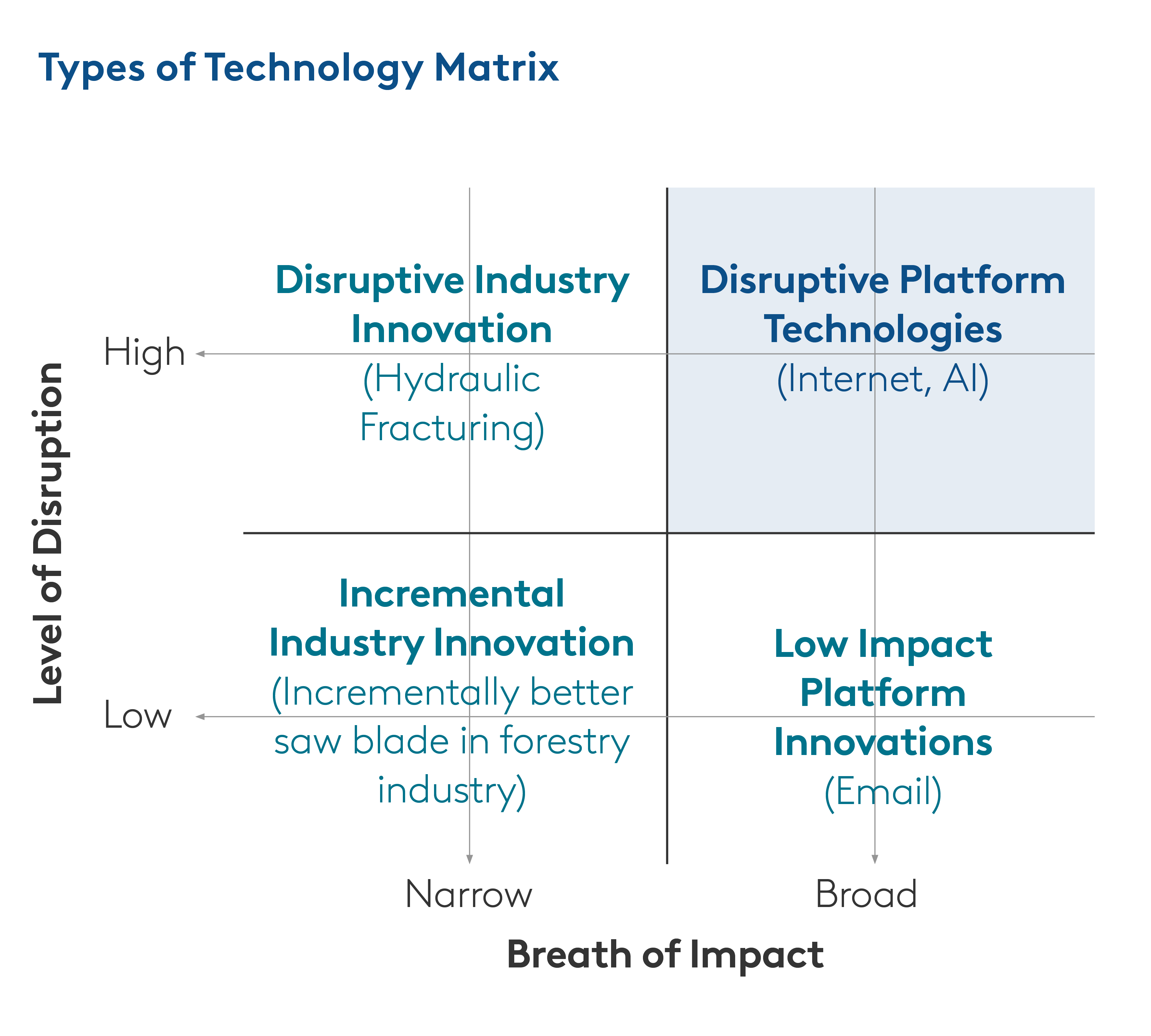 Put that into a 2×2, and the top-right box – high disruption + economy-wide impact – is the rare “disruptive platform technology."