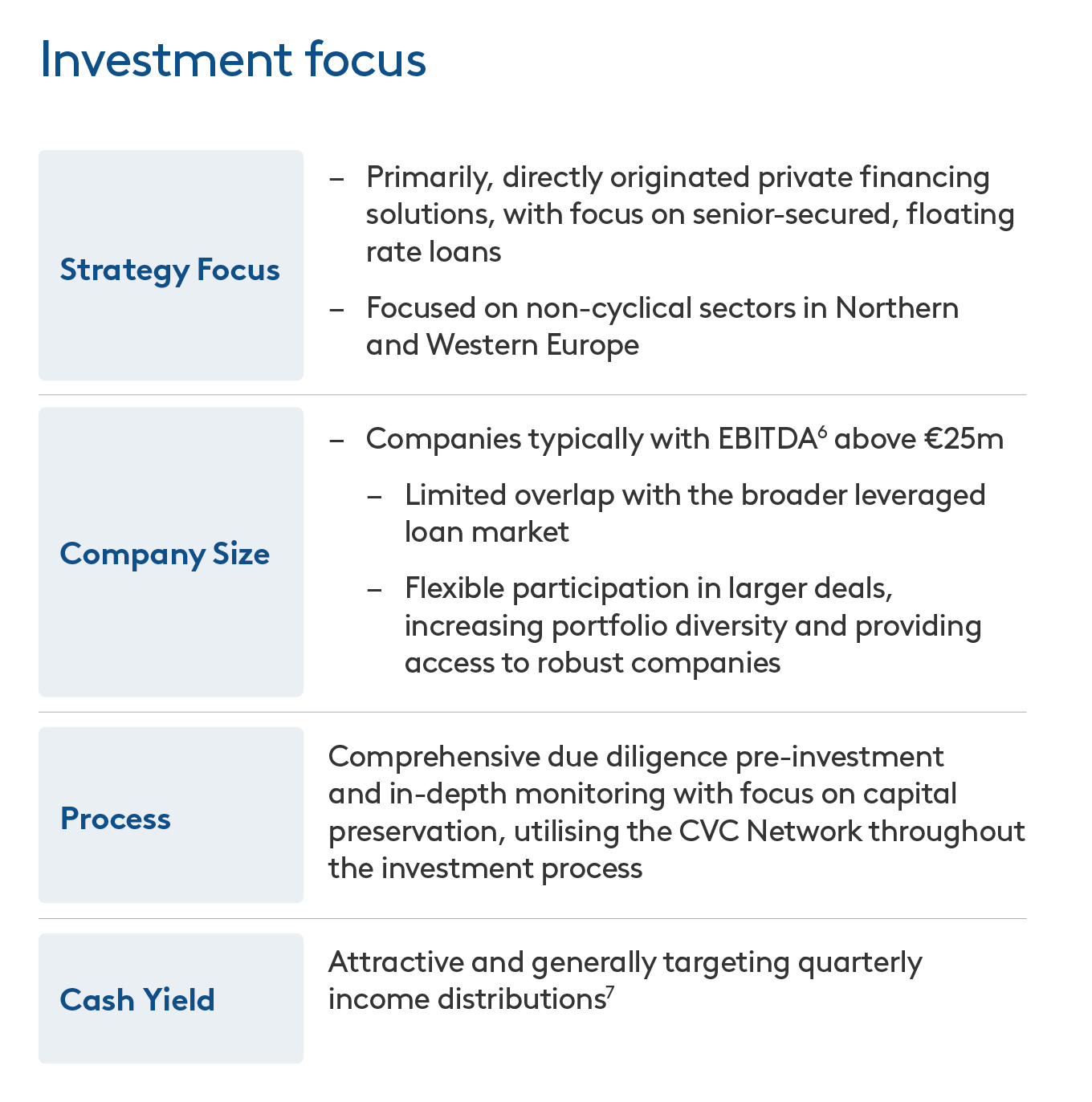 CVC-CRED combines premier access to Europe’s private credit market, where structurally wider spreads create compelling yield opportunities, with the strength of the CVC Network and the discipline of a proven investment process.